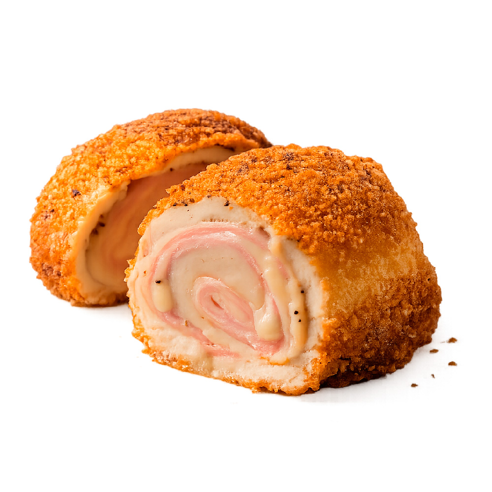 Rollo mixto de cerdo y pollo, relleno de jamón y queso, con opción de espinaca. Jugoso por dentro y crujiente por fuera gracias a su delicioso apanado dorado.
